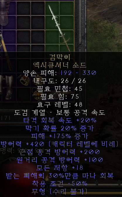 디아블로2 레저렉션 유니크 아이템 "검막이 엑시큐셔너 소드" 정보 입니다.