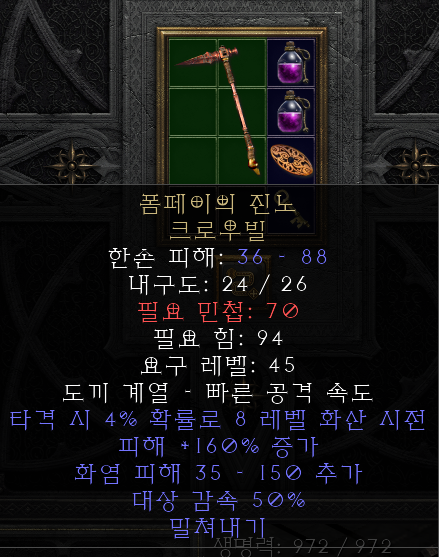 디아블로2 레저렉션 유니크 아이템 "폼페이의 진노 크로우빌" 정보 입니다.