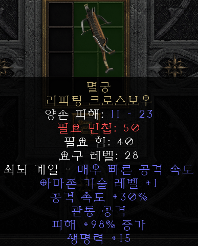 디아블로2 레저렉션 유니크 아이템 "멸궁 리피팅 크로스보우" 정보 입니다.