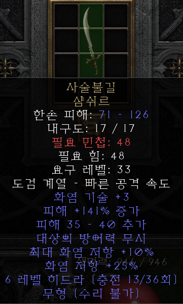 디아블로2 레저렉션 유니크 아이템 "사술불길 샴쉬르" 정보 입니다.