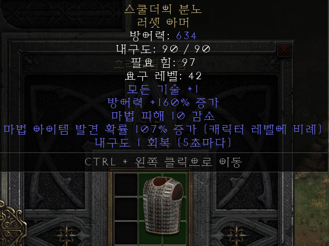 디아블로2 레저렉션 유니크 아이템 "스쿨더의 분노 러셋 아머" 정보 입니다.