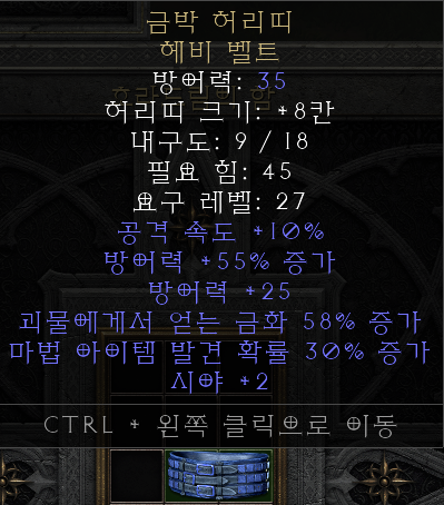 디아블로2 레저렉션 유니크 아이템 "금박 허리띠 헤비 벨트" 정보 입니다.