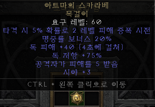 디아블로2 레저렉션 유니크 아이템 "아트마의 스카라베 목걸이" 정보 입니다.