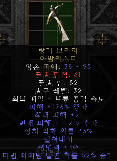 디아블로2 레저렉션 유니크 아이템 "랑거 브리저 아발리스트" 정보 입니다.