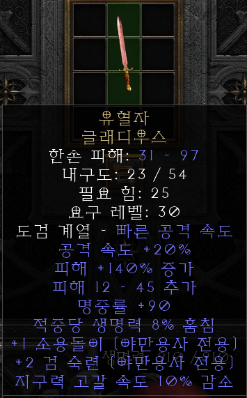 디아블로2 레저렉션 유니크 아이템 "유혈자 글래디우스" 정보 입니다.